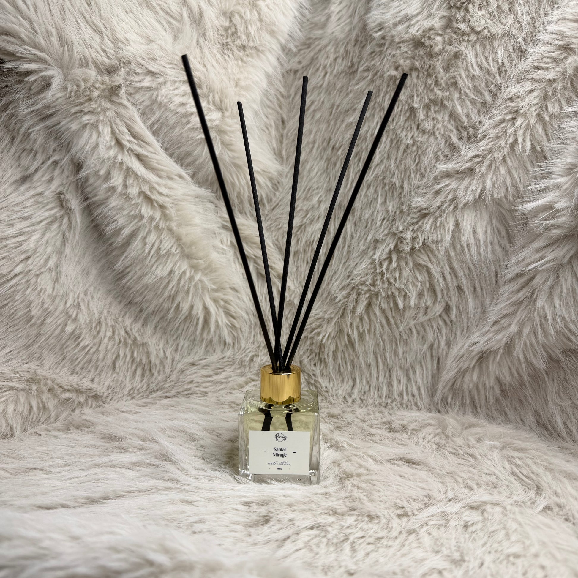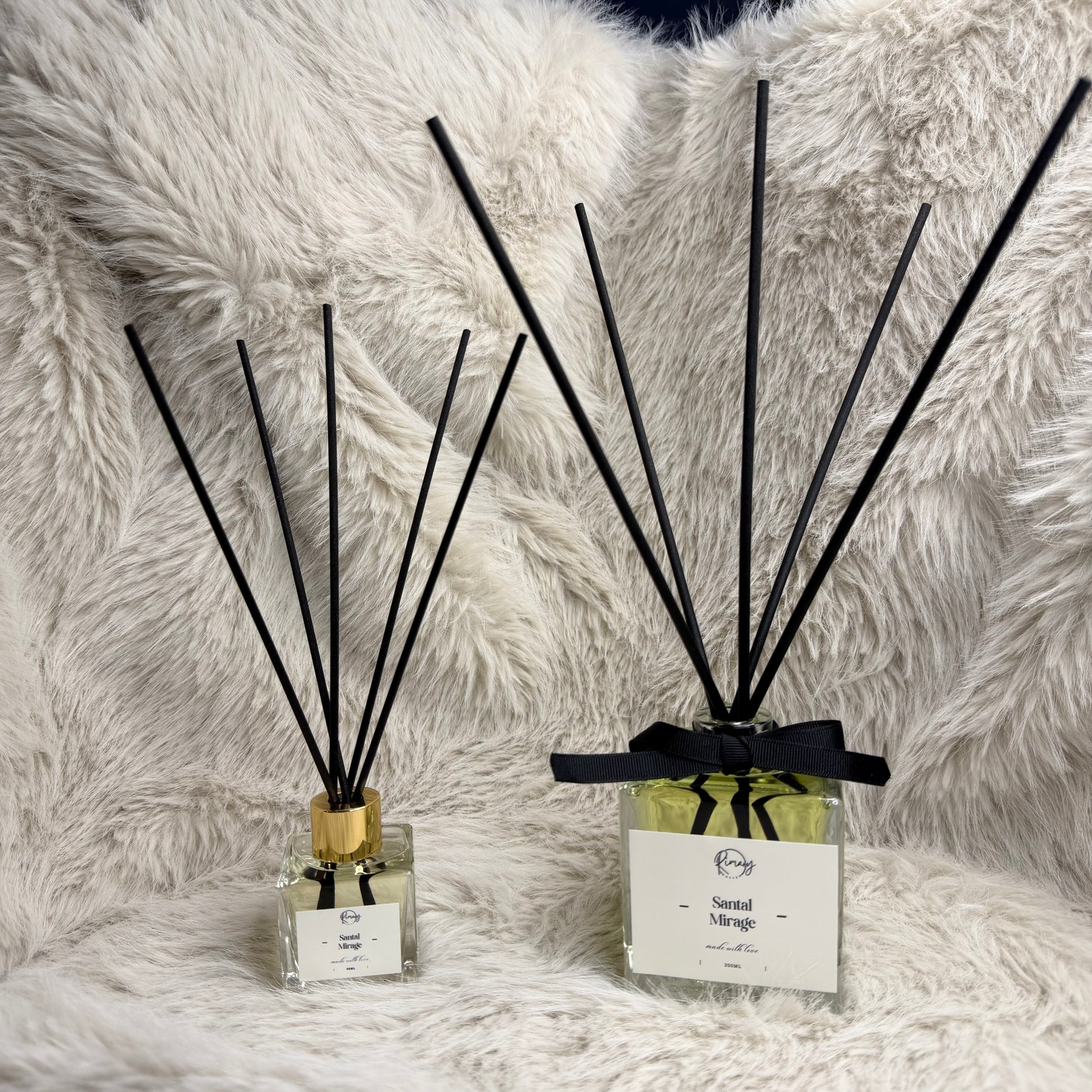 Santal Mirage er en sofistikert og varm romduft som skaper en rolig og balansert atmosfære. Duften åpner med myke kryddertoner og et subtilt blomsterpreg, før den utvikler seg til et hjerte av elegante hvite blomster. Basen hviler på kremet sandeltre med varme noter av amber og et hint av vanilje, som gir dybde, stabilitet og komfort.